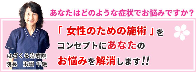 浜田先生が持つ、女性特有の症状に対しての状態を把握するカウンセリング力、症状を改善する施術力が何よりの魅力です。